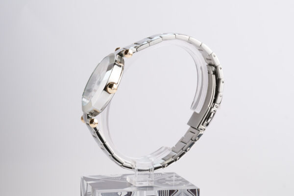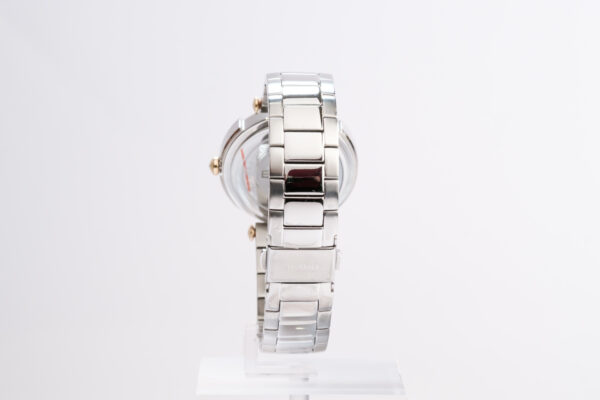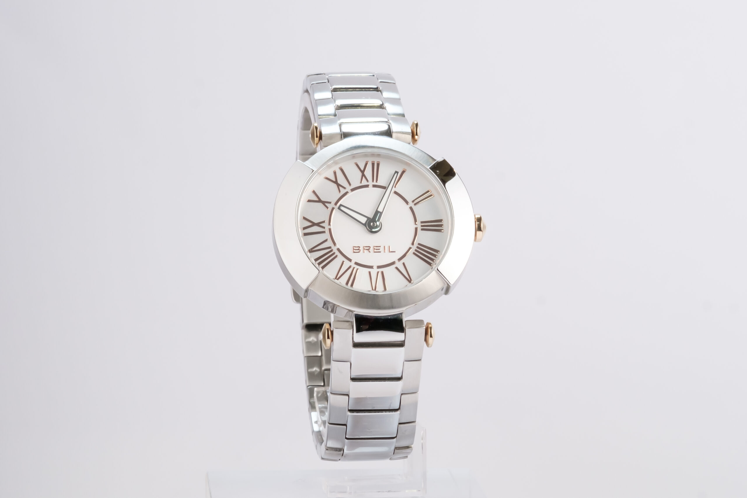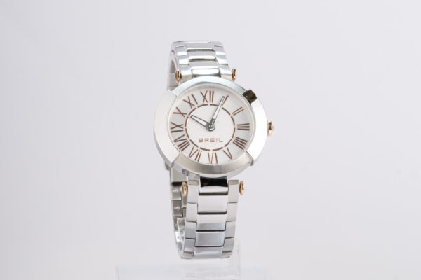 Dalla collezione Flaire di Breil, un orologio solo tempo da donna con cassa in acciaio da 35 mm, quadrante silver con numeri romani rosè e cinturino in acciaio con finiture rosè e chiusura butterfly.