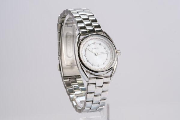 Direttamente dalla collezione Petit di Breil, orologio da donna con cassa in acciaio e diametro di 28 mm. Quadrante in mop bianca con pietre, sfere con luminous e vetro minerale. Il bracciale è in acciaio e la chiusura con pulsanti. Movimento al quarzo Miyota 5Y20. Resiste all’acqua fino a 10 Atm. Referenza: TW1650.