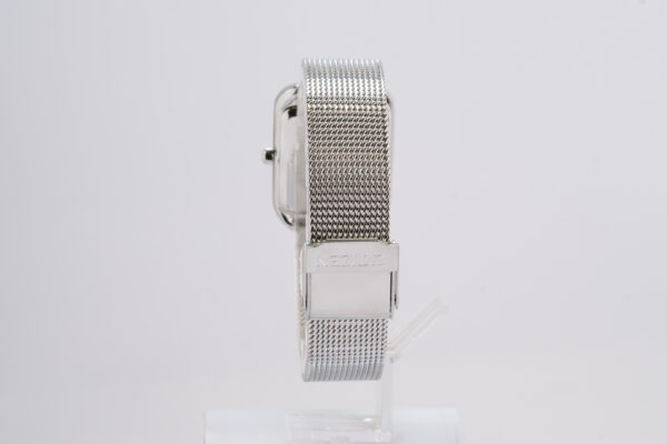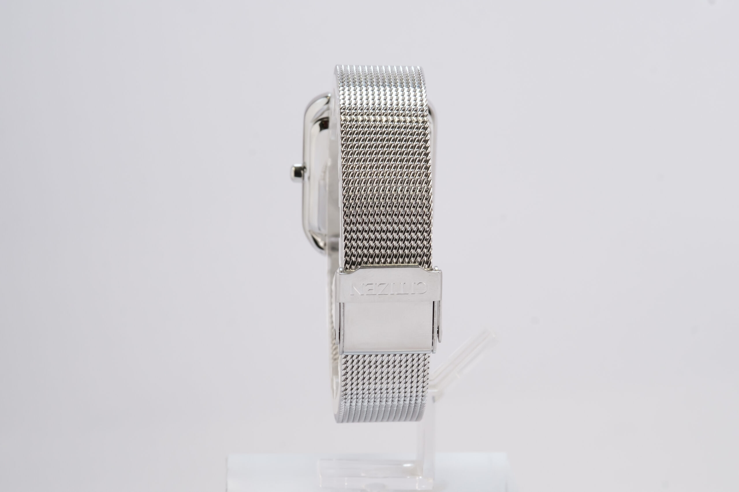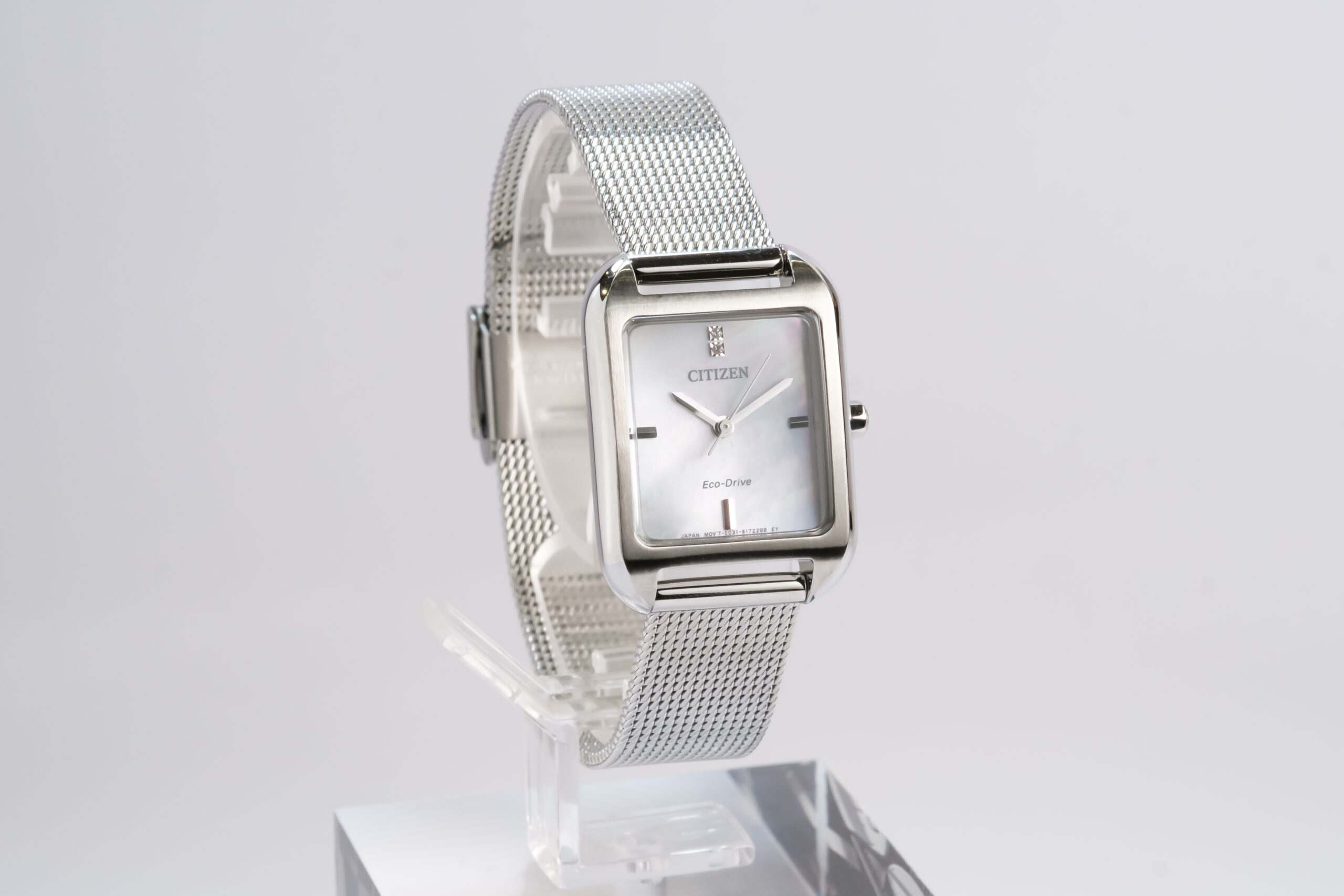 Orologio da Donna Citizen, modello Classic Lady solo tempo. Movimento Eco Drive a carica di luce con riserva fino a 180 giorni. Cassa e bracciale con maglie in acciaio, vetro minerale. Dimensioni della cassa 31 mm, colore del quadrante in madreperla. Molto leggero, peso 42 gr. Resistente all’acqua fino a 5 bar.