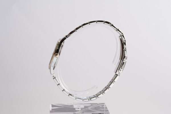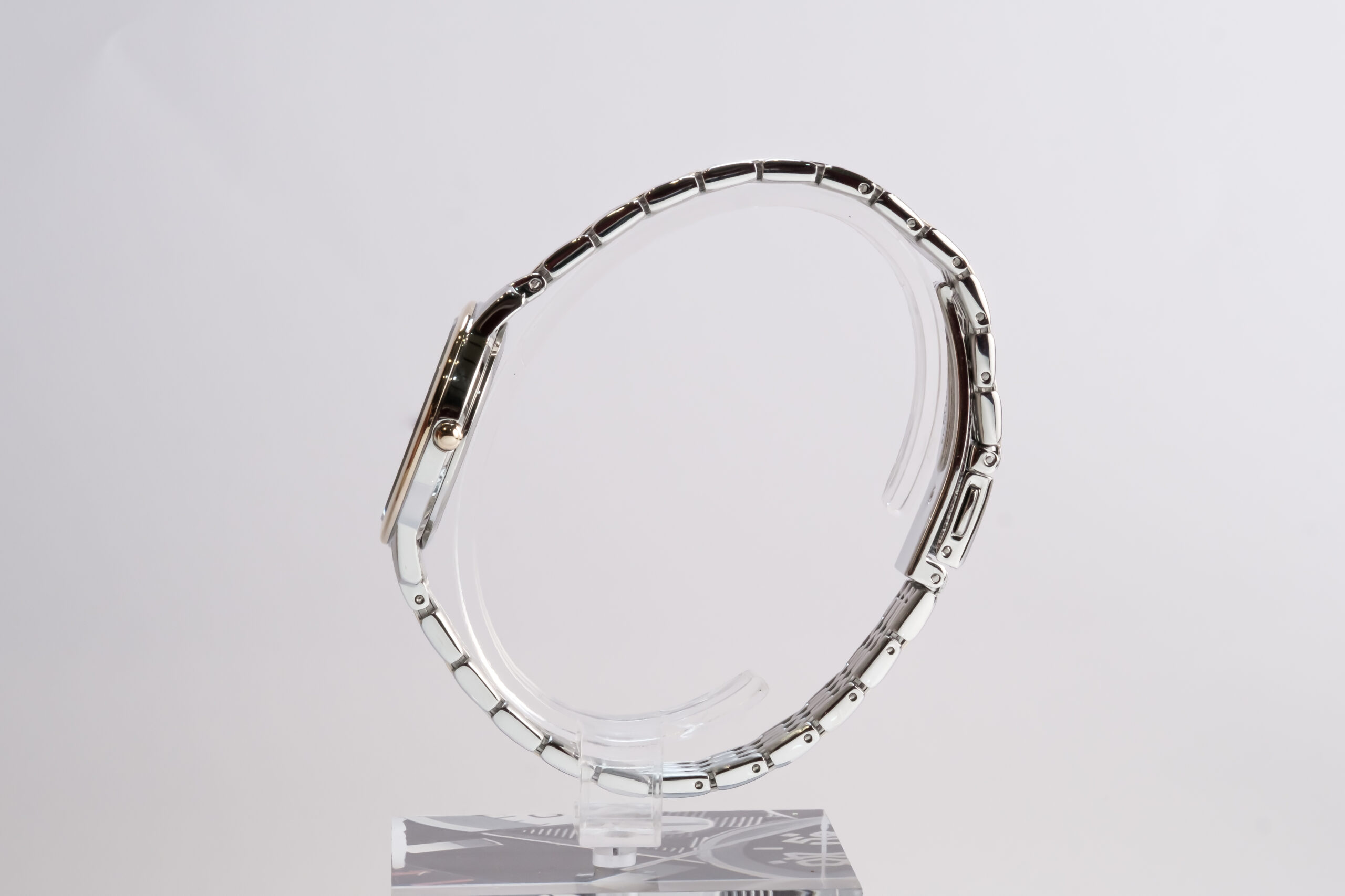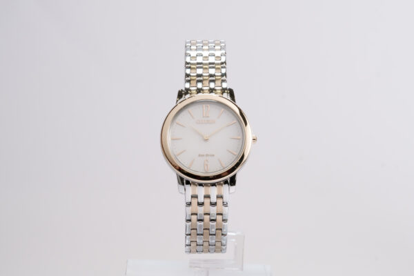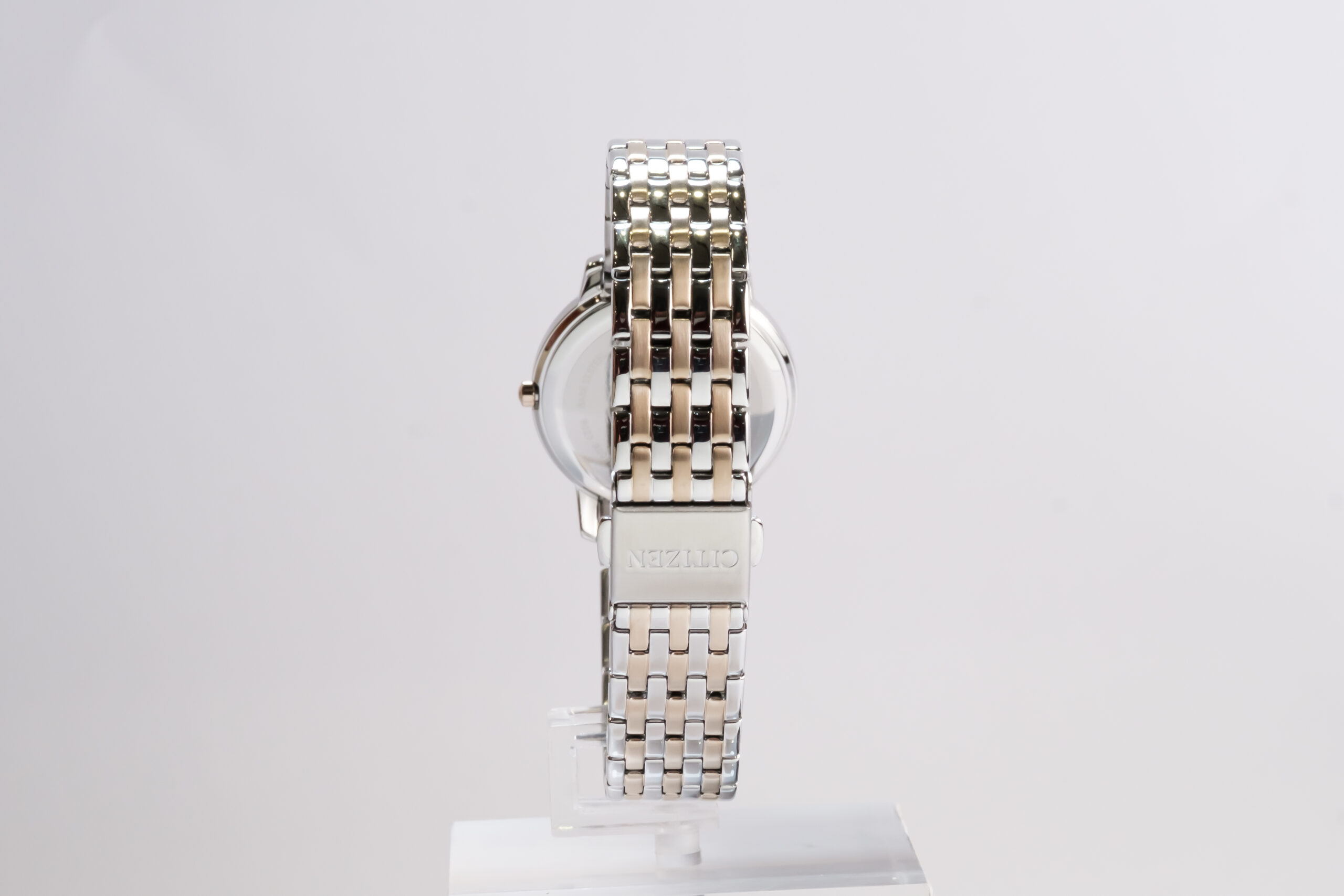 Orologio da Donna Citizen modello Eco Drive Lady ex1496-82a. Movimento con ricarica a luce e tenuta fino a 180 giorni. Modello con cassa in acciaio dal diametro 30mm e quadrante in madreperla con indici applicati e 2 numeri arabi. Vetro minerale con bracciale in acciaio e cinturino con chiusura a pulsante. Resistente all’acqua fino a 5 bar.