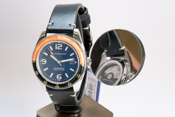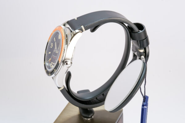 Orologio della serie Fleuss, ispirata al lavoro di Henry Albert Fleuss. Movimento Seiko TMI NH35, cassa in acciaio inossidabile dal diametro di 43 mm, vetro zaffiro. Il cinturino è in vera pelle con fibbia ad ardiglione. Resistenza all’acqua fino a 15 atm (150 m).